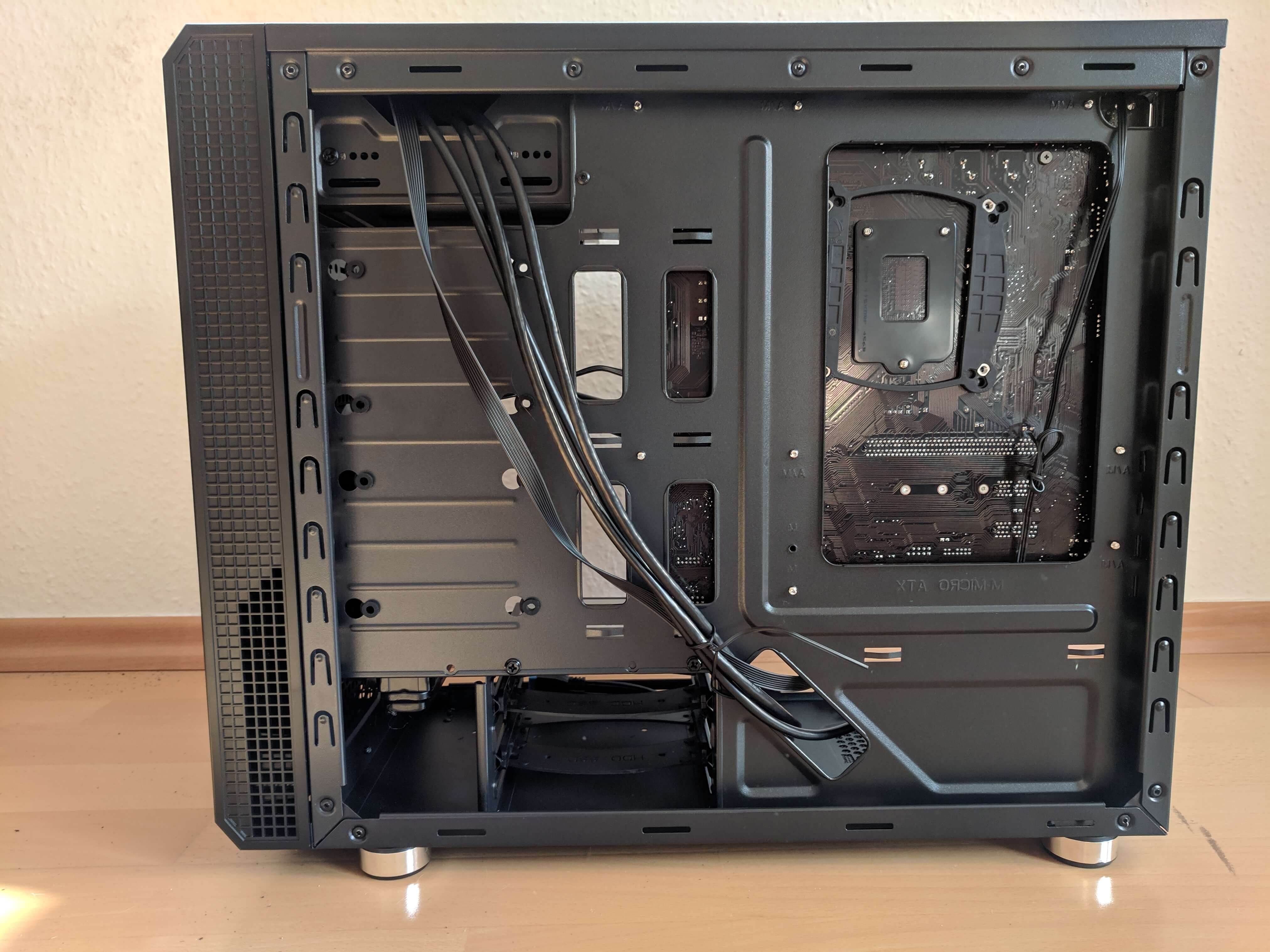 Air flow was my big concern. After all it supports way less fans than the typical mid-ATX tower. To make matters worse, the air holes at the side of the front panel are mostly just decoration: Only the lower area is perforated completely, the upper part covered by plastic. This will help reduce the noise that can pass at the front, but it lowers air flow. Because of this I wouldn’t recommend running a 300W gpu and an overclocked Threadripper in this case, but for regular consumer hardware the thermal performance was surprisingly decent, with no overheating issues whatsoever.